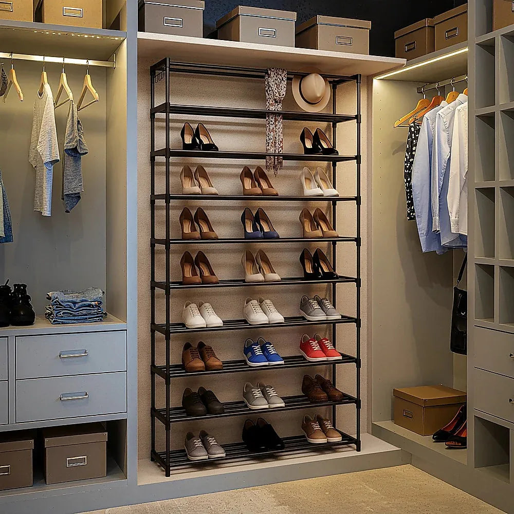 Are you tired of seeing shoes scattered all over the floor? Our 10-tier shoe rack offers a practical solution by providing ample storage space for every member of your family. From adult shoes to children's shoes, flats to sneakers, and even high-top shoes, this sleek and functional metal shoe shelf will offer them a sturdy home.