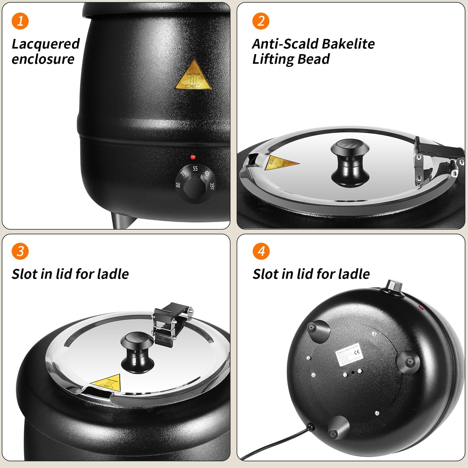 With a generous 10.5-quart (10L)capacity, this soup warmer is perfect for larger gatherings. Constructed with food-grade stainless steel inner pot, it ensures durability and safe food handling.