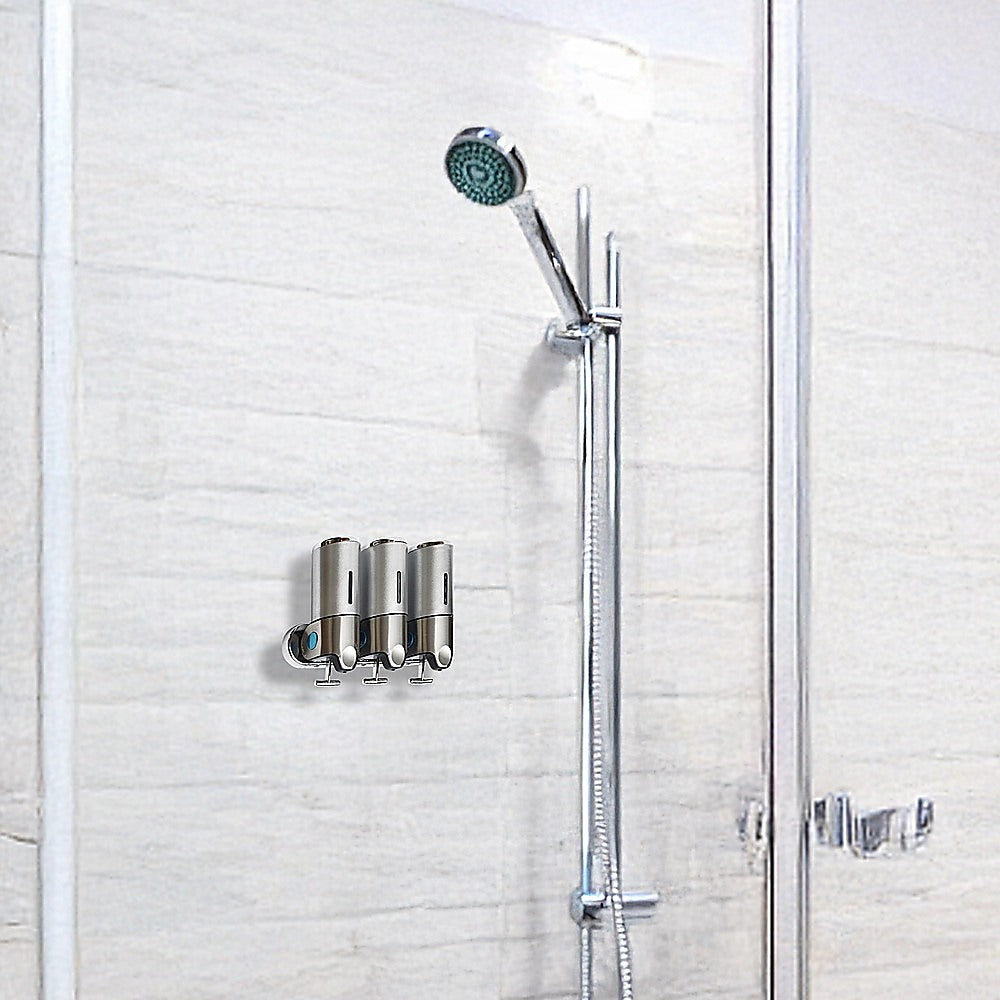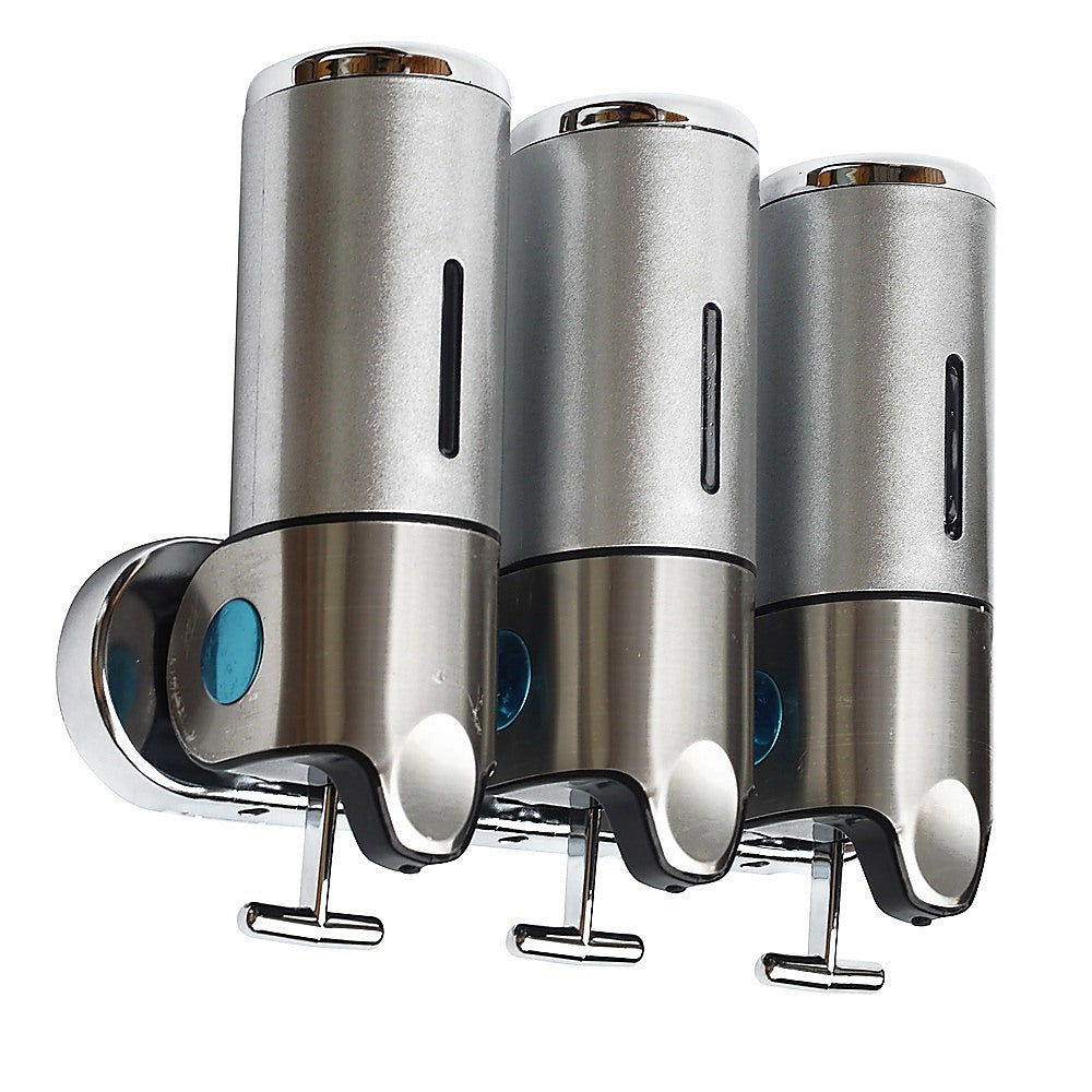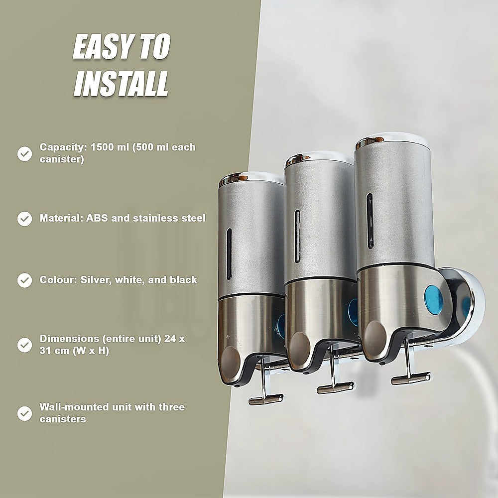 With its sleek, ergonomic design, this shower soap dispenser looks great in your shower. Install another one near your sink and keep your benchtops free from clutter. With three separate canisters attached to a single bar, the dispenser can store three different kinds of soaps, shampoos, lotions, or gels.