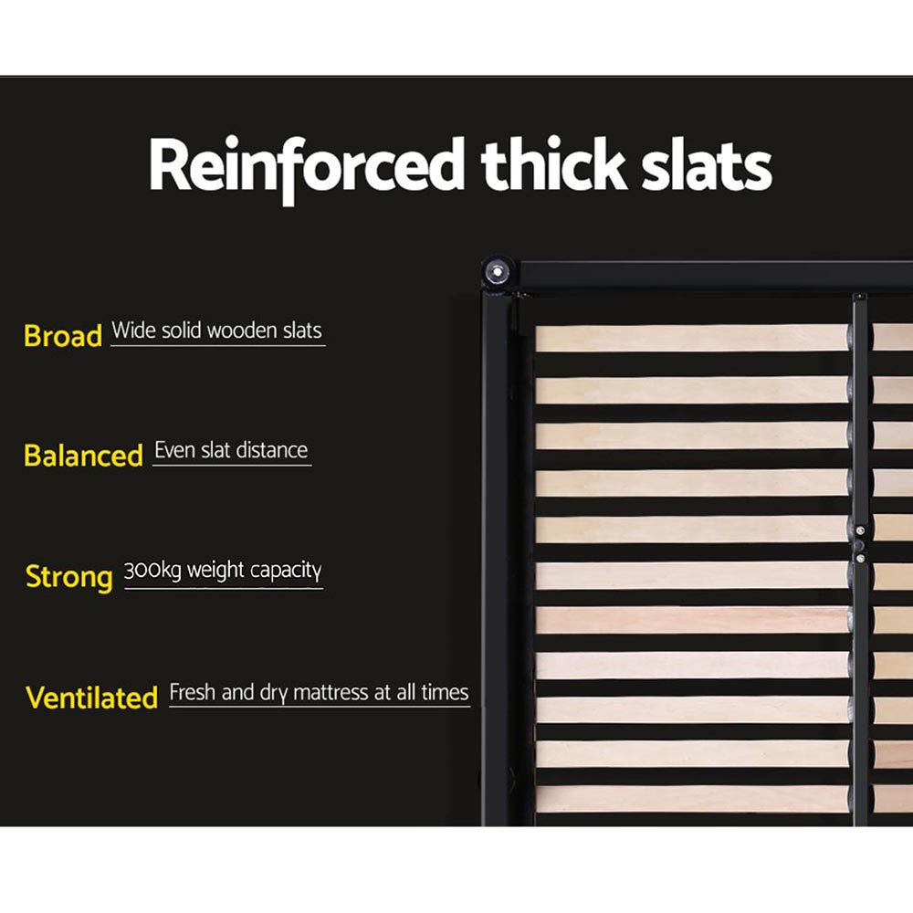 Not least, the structure is constructed with a sturdy steel frame utilising reinforced steel bars and heavy-duty connectors, and matched with a wooden arch slat base for even weight distribution. An adjustable centre support strut further helps to stabilize the entire ensemble.
