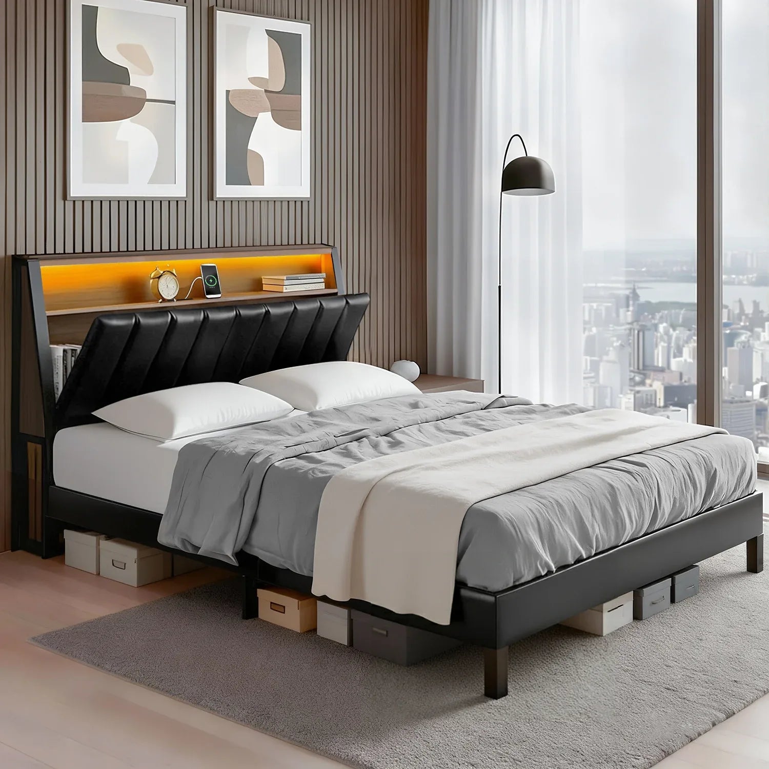 Artiss Double Bed Frame LED Storage Headboard with Charging Station Black