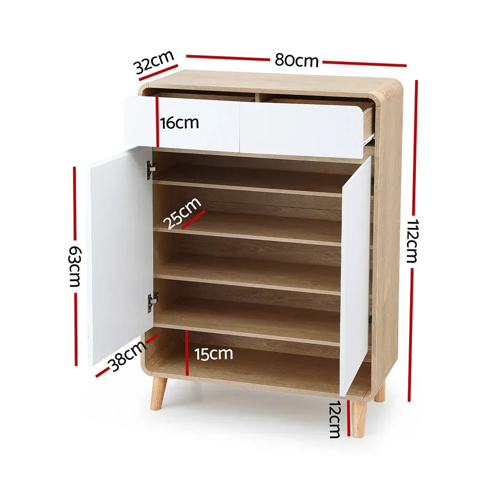 Maximise your entryway or hallway space with this sturdy Artiss shoe cabinet! Featuring 5 tiers and 2 ample storage drawers, it holds up to 20 pairs (size dependent), offering versatile shoe storage for your home.