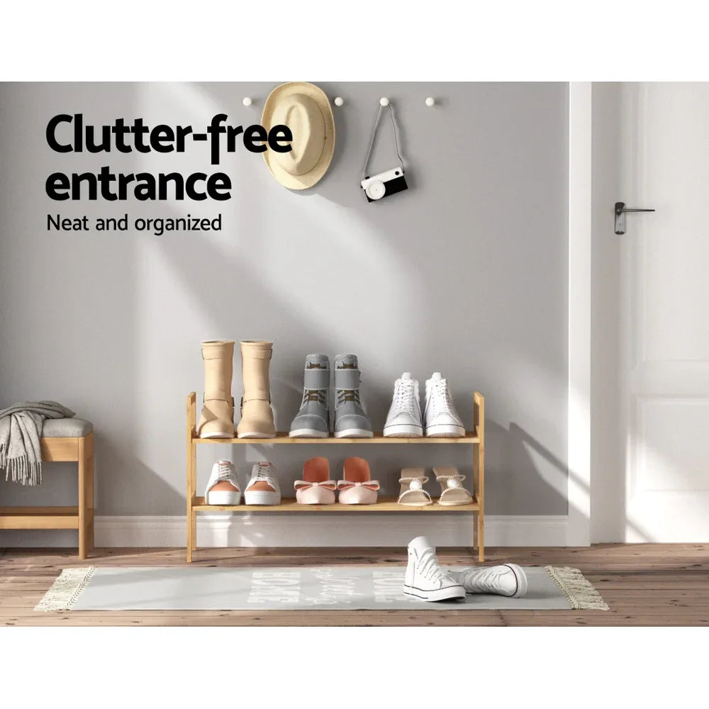 The Artiss Hina Shoe Rack will help you keep the home neat and tidy without compromising on style. With its sturdy quality bamboo frame and smooth, clean surface, you can trust the shoe rack to keep your daily essentials at hand. natural wood grain colour will blend in with most interior styles. The two-tier open shelves give you plenty of room for essentials, while gaps along each shelf encourage proper airflow to prevent dampness, mould and mildew. The rack can store up to six pairs of shoes to keep the whole family organized. With simple assembly instructions, your hallways will be clutter-free in no time. Get yourself an Artiss Hina Shoe Rack and never lose your shoes at home again.