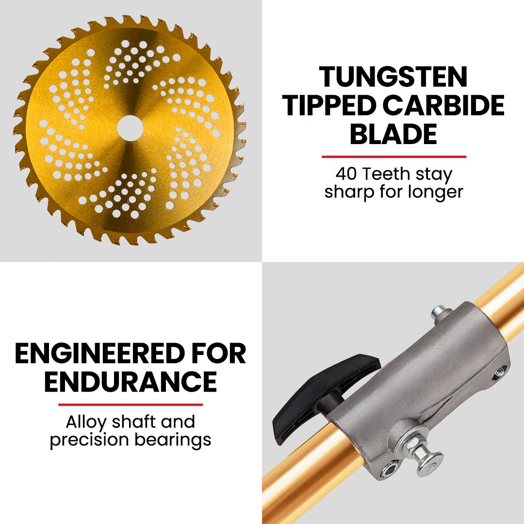 - Blades: 40T Gold Series Saw, 8T Saw, 3T Slasher, 2T Lawn Edger, Weed Brush Steel Wire Trimmer