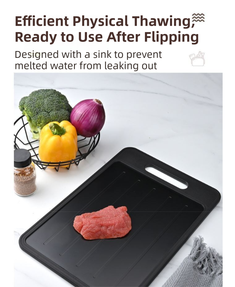 - Dual-Sided Design: Aluminum side for thawing; PP side provides a non-slip, food-grade cutting surface that is hard and resistant to high/low temperatures.