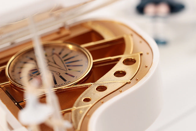 This product does not contain a lithium battery. This is a delicate mechanical item and not a toy intended for rough play by very young children. Wind the mechanism gently; do not overwind. Keep away from dust and moisture to ensure longevity. The specific melody played may vary. Small parts may present a choking hazard for children under 3 years old; adult supervision recommended if handled by young children. Figurines and other items shown in lifestyle images are for decorative context only and are not included with the music box itself.
