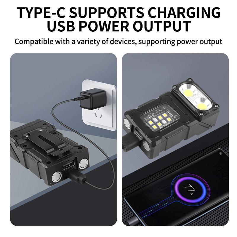 Illuminate your workspace with this COB+LED Work Light, a versatile and powerful tool designed for emergencies and everyday use. Featuring a digital display, this light offers 7 lighting modes, including 2*9 COB (strong/weak/flashing), 6*LED warm yellow light, and 1*LED red/blue warning lights, with a brightness of 300-400 lumens and a range of up to 100 meters. The 180 Degree rotatable head and magnetic base allow for hands-free operation, while the built-in 200mAh battery ensures long-lasting performance with Type-C USB charging. Compact at 8.1 x 4.5 x 2.5 cm and weighing only 75 grams (net), this IPX4 water-resistant light is perfect for outdoor activities, repairs, and emergencies.