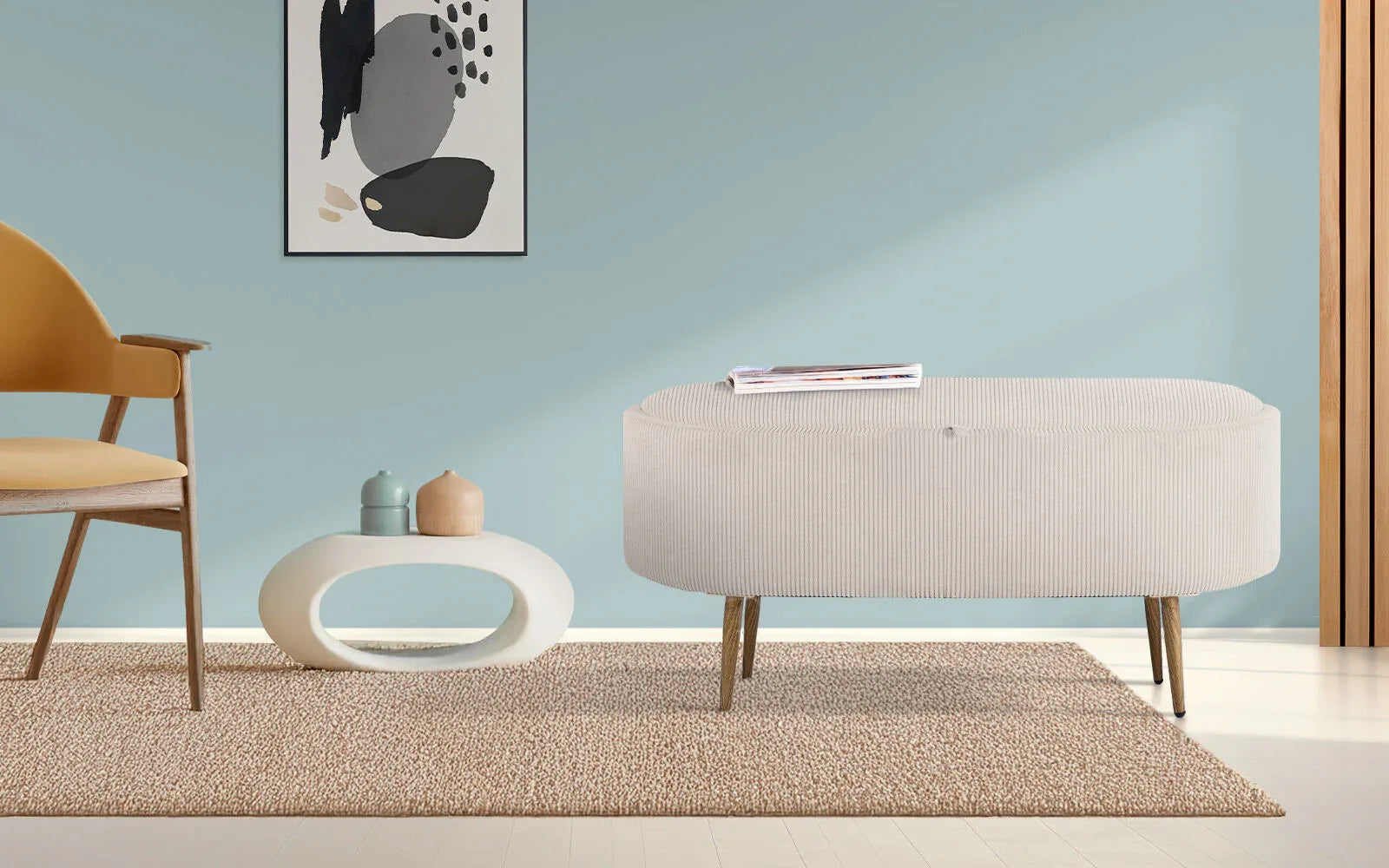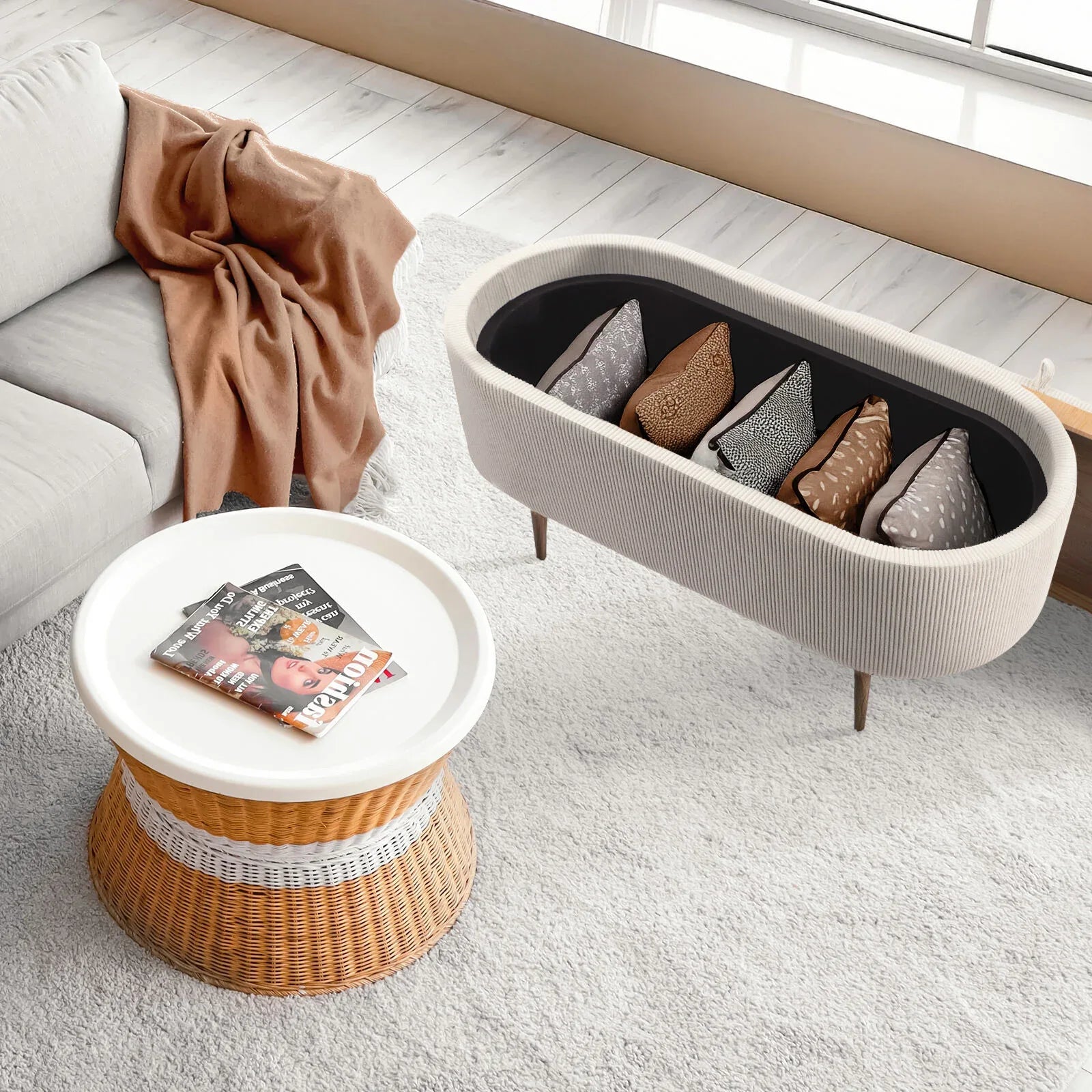 With soft ribbed corduroy fabric and plush foam cushioning, it invites you to sit back and unwind. Need extra table space? Just flip the lid to reveal a sleek tray surface, perfect for drinks, books. Inside, there's roomy storage for blankets, toys, or daily clutter.