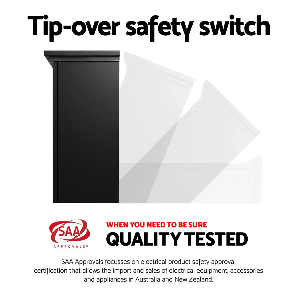 Old world charm with a modern touch. The Devanti Electric Mantel Fireplace delivers dazzling warmth with radiant glows. With its classic design, the mantel fireplace captures the mood of a traditional fireplace with a contemporary update. More importantly, the aluminium heating elements actually helps to maintain natural humidity in the air for comfortable heat without drying out the room air. The heater heats up rapidly and uses over 90% less energy than gas for better costs savings. Good all-round heating is also ensured with the fan-assisted heated air circulation. And if flickering flames are a must, our fireplace provides a 3D flame effect with glowing embers for a totally authentic presence. Constructed of MDF board with a black tempered glass casing, the fireplace is strong and durable. Convenient adjustments from the handy remote control include high/low heat settings, nine-hour timer setting and thermostat for the desired warmth and ambience. The fireplace features overheating protection, auto shut-off and no worries about carbon dioxide emissions, odours or fumes from traditional fireplaces.
