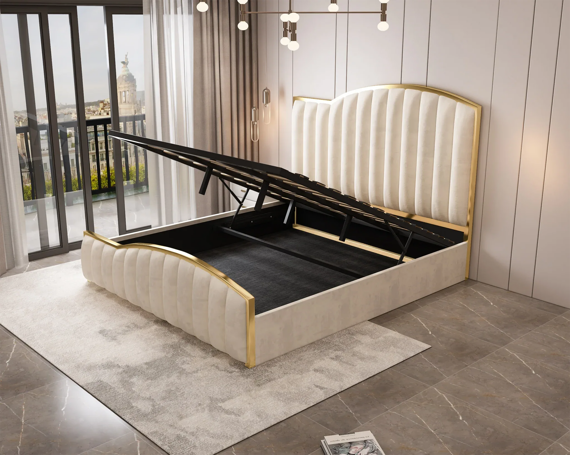 Elegant Luxury King Size Bedframe in Beige with Gas Lift Storage Velvet Fabric Golden Trim