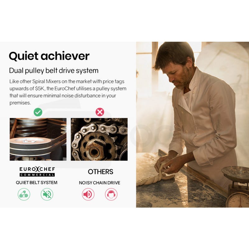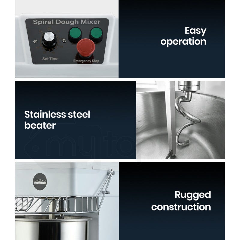 Eurochef Spiral mixers are ideal for business owners who recognise the importance of quality and reliability for increasing production and maximising profits. The EuroChef Commercial range is offered directly at wholesale prices, making this spiral dough mixer a smart investment for savvy owners of bakeries and pizzerias.