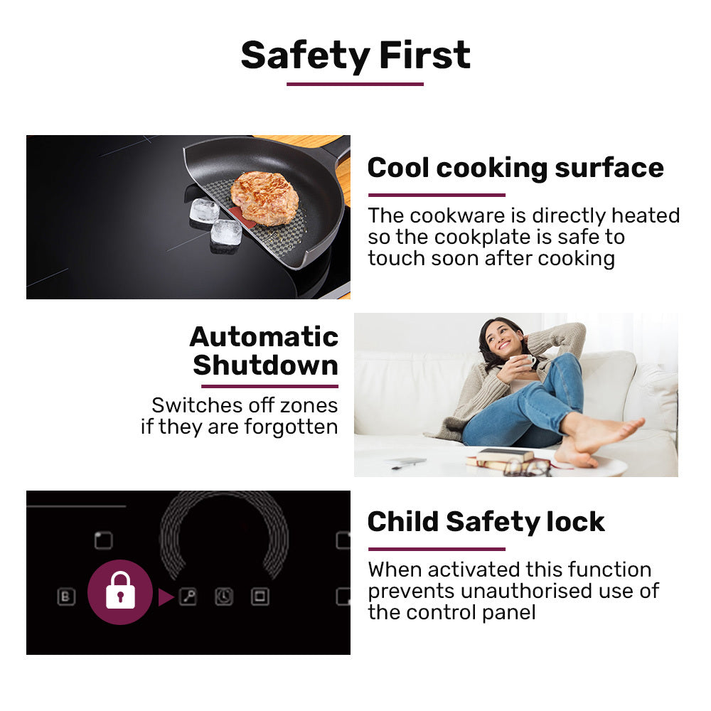 Safety features include an auto-safety shutdown, a child lock function, and the surface cools soon after cooking for peace of mind and easy cleaning. With advanced EuroChef Induction technology you’ll be inspired to release your inner Masterchef!