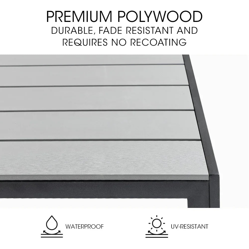 - Premium natural-looking polywood tabletop that requires no upkeep
