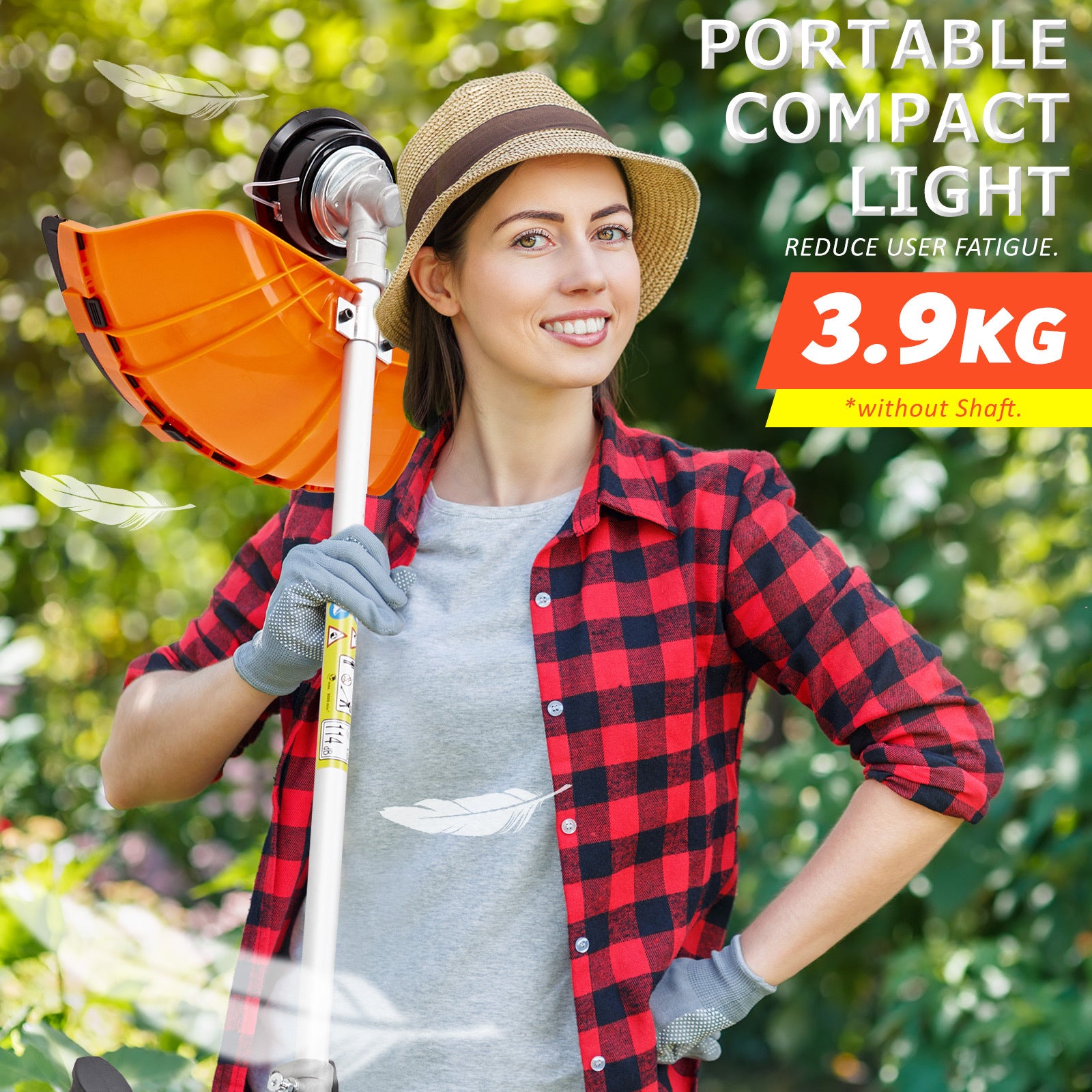 This 43cc Brush Cutter is an extremely lightweight and professional cutter with plenty of power. The Ergonomically designed Asymmetrical double handle create unsurpassed balance, absolute safety and manoeuvrability. Powerful engine with rapid acceleration brush cutter for forestry business. Utilising premium Commercial Alloy, features a commercial grade quick connect couplings equipped with dual ball-bearing floating centres. Correctly Sized at 182cm Long, genuine commercial fastening ensures superior stability - essential for safe handling. It now comes with 5 different attachement heads to suit different tasks.