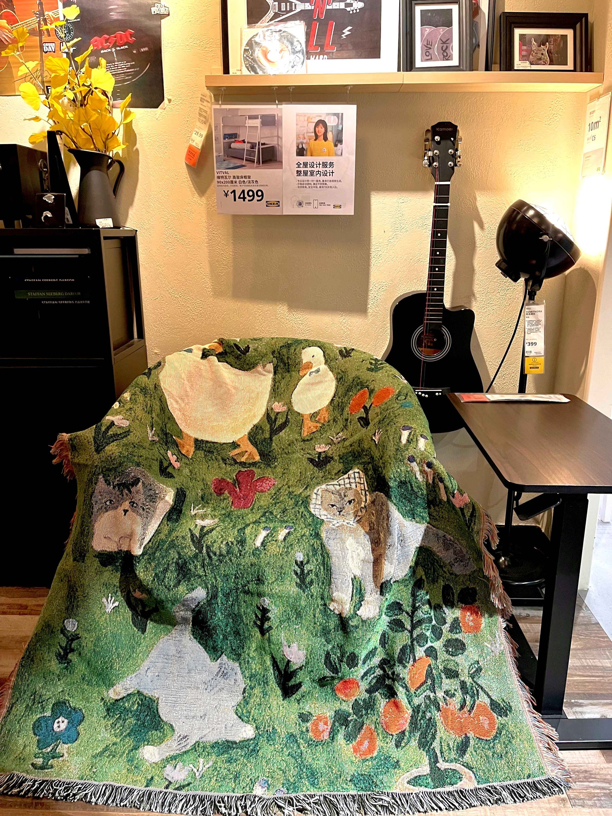 - Design: Floral and cat pattern with tassel fringe