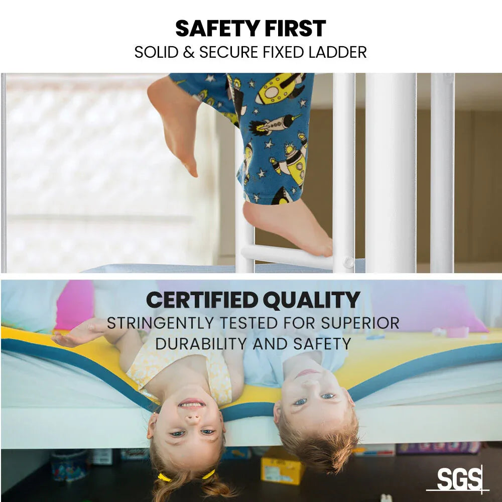 The strong tubular metal frame has a matte white non-rust finish with matching fastenersso this bunk bed not only looks great, but is also built to last! With safety in mind, this bunk bed has no sharp edges and smooth welded joints. It also features a solid and secure fixed ladder that is easy to climb without the wobbles of other less sturdy bunk beds.