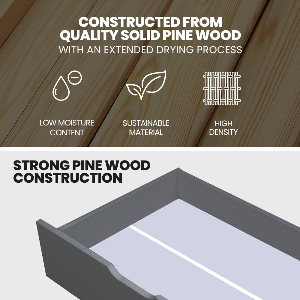 Crafted from robust solid pine, these drawers glide effortlessly on smooth-running castor wheels. Enhance your bedroom's functionality instantly with these stylish and practical storage trundles.