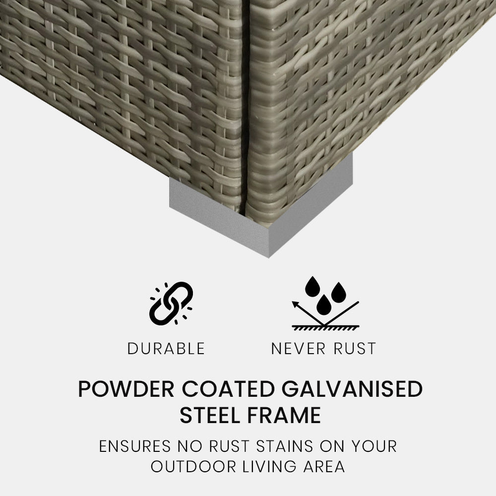 This London Rattan 4 Seater Outdoor Lounge Set with a Coffee Table is a stylish yet affordable setting designed to provide utmost comfort. The London Rattan outdoor furniture setting has a durable galvanised steel frame with additional powder coating, ensuring no rust stains on your outdoor living area.