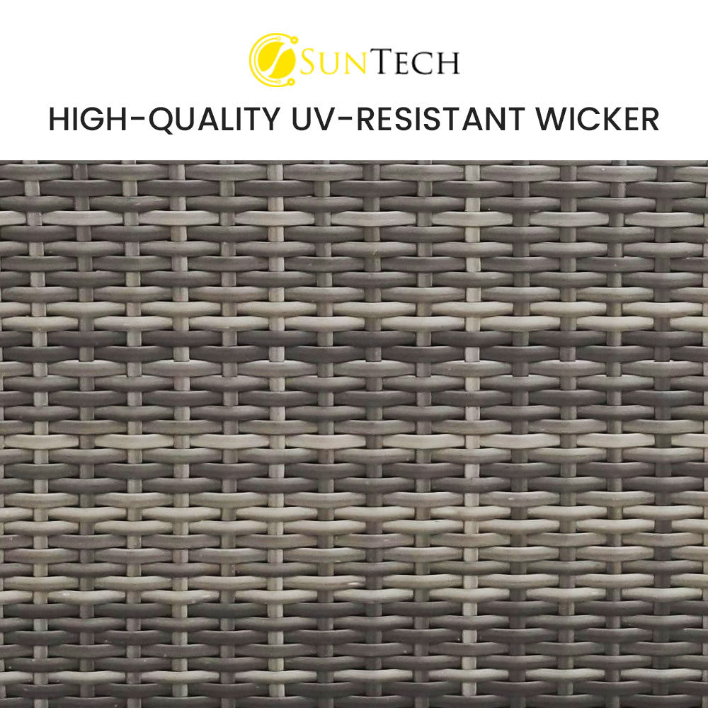 The set includes ultra-comfy 8cm thick water-resistant seat cushions, generous backrest cushioning and two throw cushions. The high-quality UV-resistant handwoven Suntech wicker in Marl Grey weave has a premium natural textured look. This a modular design comprising 2 sofas, two corner sofas, plus a coffee table with tempered glass table top. You can set it up in whatever configuration works best for you, making this London Rattan outdoor lounge setting a great addition to any outdoor space.