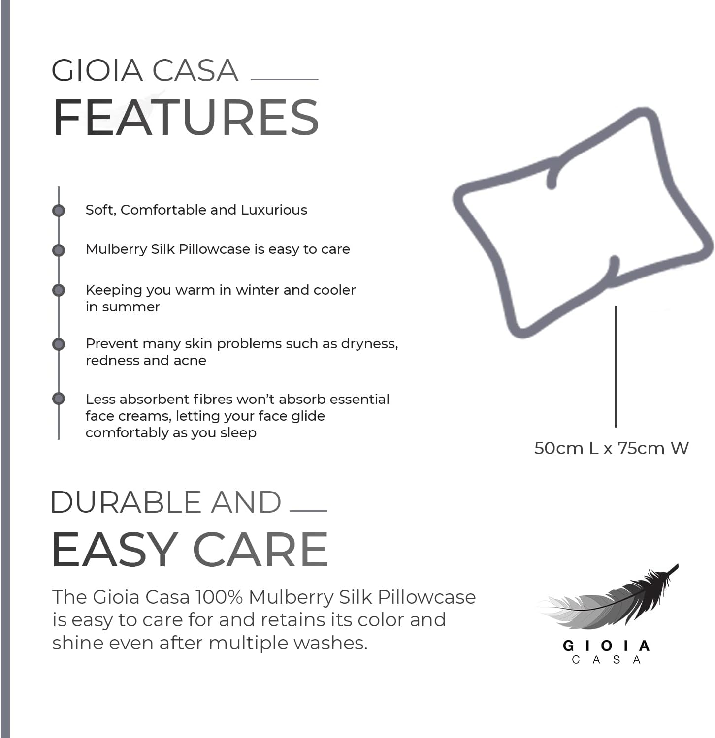 Gioia Casa Luxury Pillowcase - 100% Pure Mulberry Silk on Both Sides - Soft Anti-Wrinkle, Hypoallergenic, Washable Bed Pillowcases - Premium Pillow Cover for Hair and Skin Protection