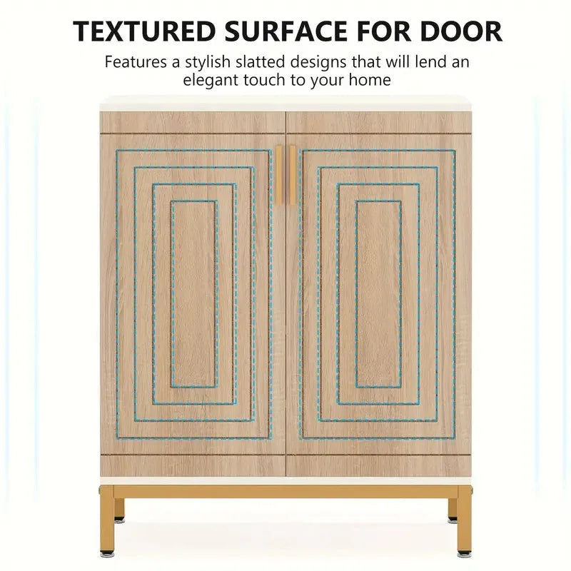 The high metal legs in gold not only add a touch of elegance but also make cleaning under the cabinet easy and convenient. The removable shelves inside allow for versatile storage, accommodating shoes of different heights and large sizes. The top of the cabinet can be used for decoration or storing daily essentials, while the bottom provides extra space for additional shoes.