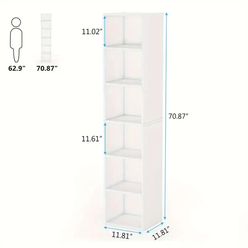 Transform your home or office with this sleek and functional 6-Tier Cube Display Shelf. Standing at 70.9 inches tall and designed with a slim profile, this modern white corner bookcase is perfect for maximizing space in small areas. The contemporary style seamlessly blends with any decor, making it a versatile addition to your living room, bedroom, study, or even bathroom.