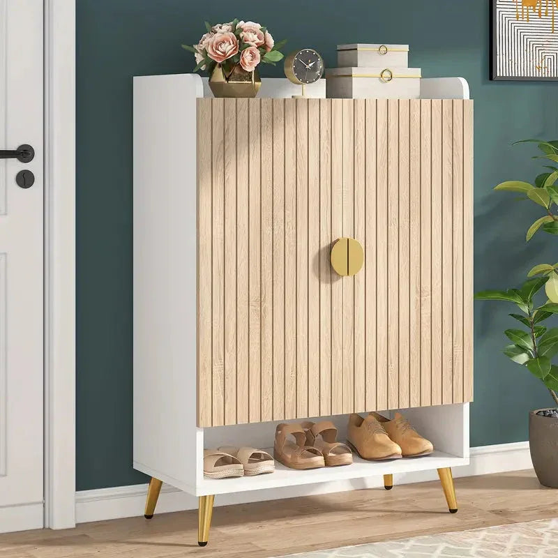 Description: Transform your home with our 7-Tier Shoe Storage Cabinet, a blend of functionality and modern elegance. Crafted from sturdy E0 particle board, this shoe cabinet is designed to withstand daily use without compromising style. Its adjustable shelves allow easy customization for different types of footwear, from slippers to boots, accommodating up to 24 pairs of shoes. The sleek white finish, enhanced with durable gold accents, adds a touch of sophistication to any room. With two swinging doors providing ample concealed storage, it's not just a shoe rack but a versatile organizational solution for your home. Perfect for keeping your hallway, entryway, closet, or dorm room neat and tidy while making a stylish statement.