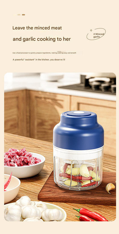 Powerful Mini Electric Food Chopper - USB Rechargeable Cordless Garlic & Meat Mincer(Blue 250ml + 4-blade knife)