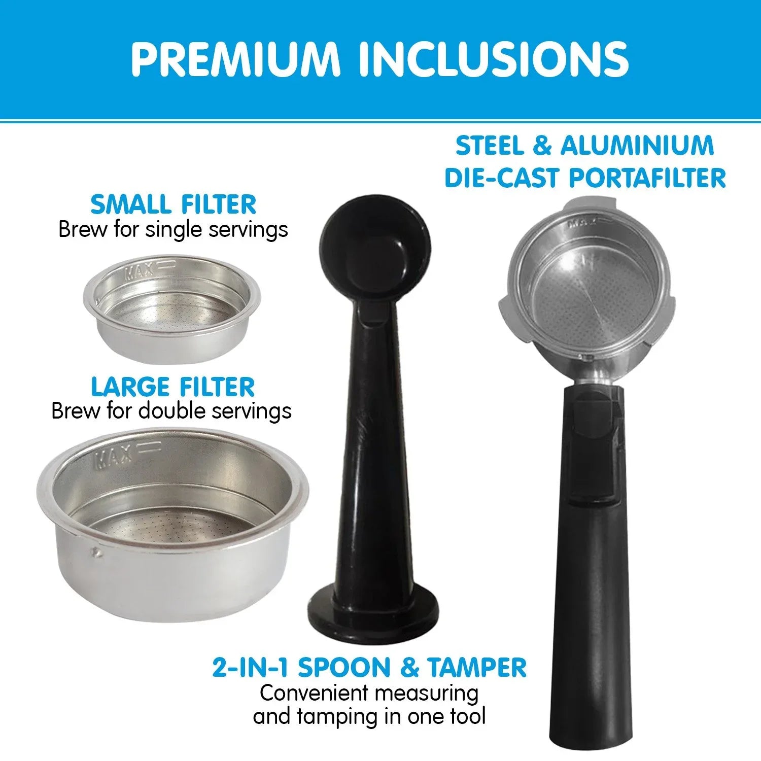 Awaken your senses with café quality coffee right at home. The Pronti Coffee Machine combines power and precision with a 20 bar Italian pump that extracts rich espresso topped with golden crema, while the high pressure frother whips up velvety milk for lattes and cappuccinos. Built with a durable diecast aluminium boiler and safety features against overheating and overpressure, it delivers reliability with every brew. The 1.25L detachable water tank and removable drip tray make cleaning simple, while the cup warmer, dual stainless steel filters and handy 2 in 1 spoon tamper ensure every cup is brewed to perfection, whether single or double.