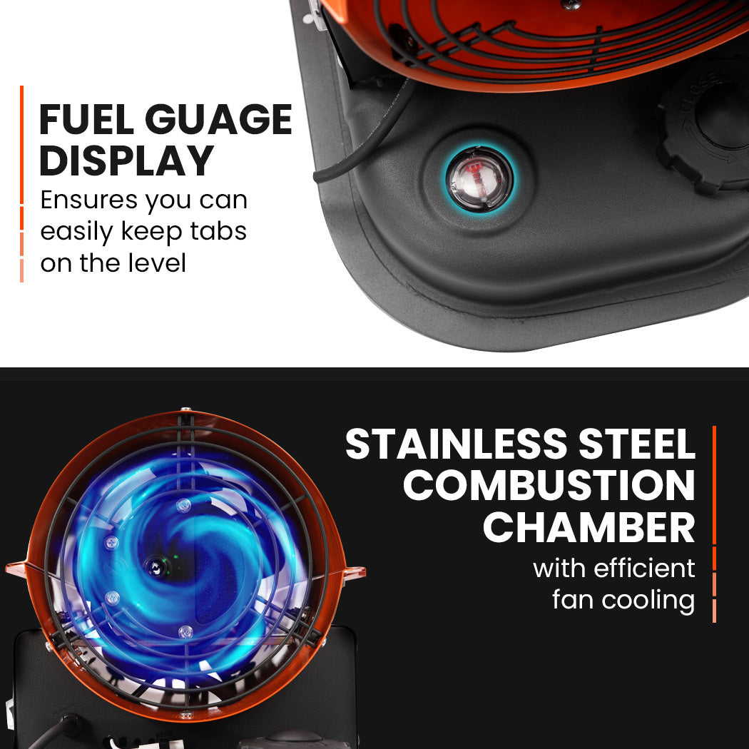 Importantly, this Portable Blow Heater is an exceedingly safe unit to have functioning in busy environments. It has built-in features which protect against overheating, flame-outs and electrical power breakdowns. Moreover, it operates on both Diesel and Kerosene fuel for greater versatility.
