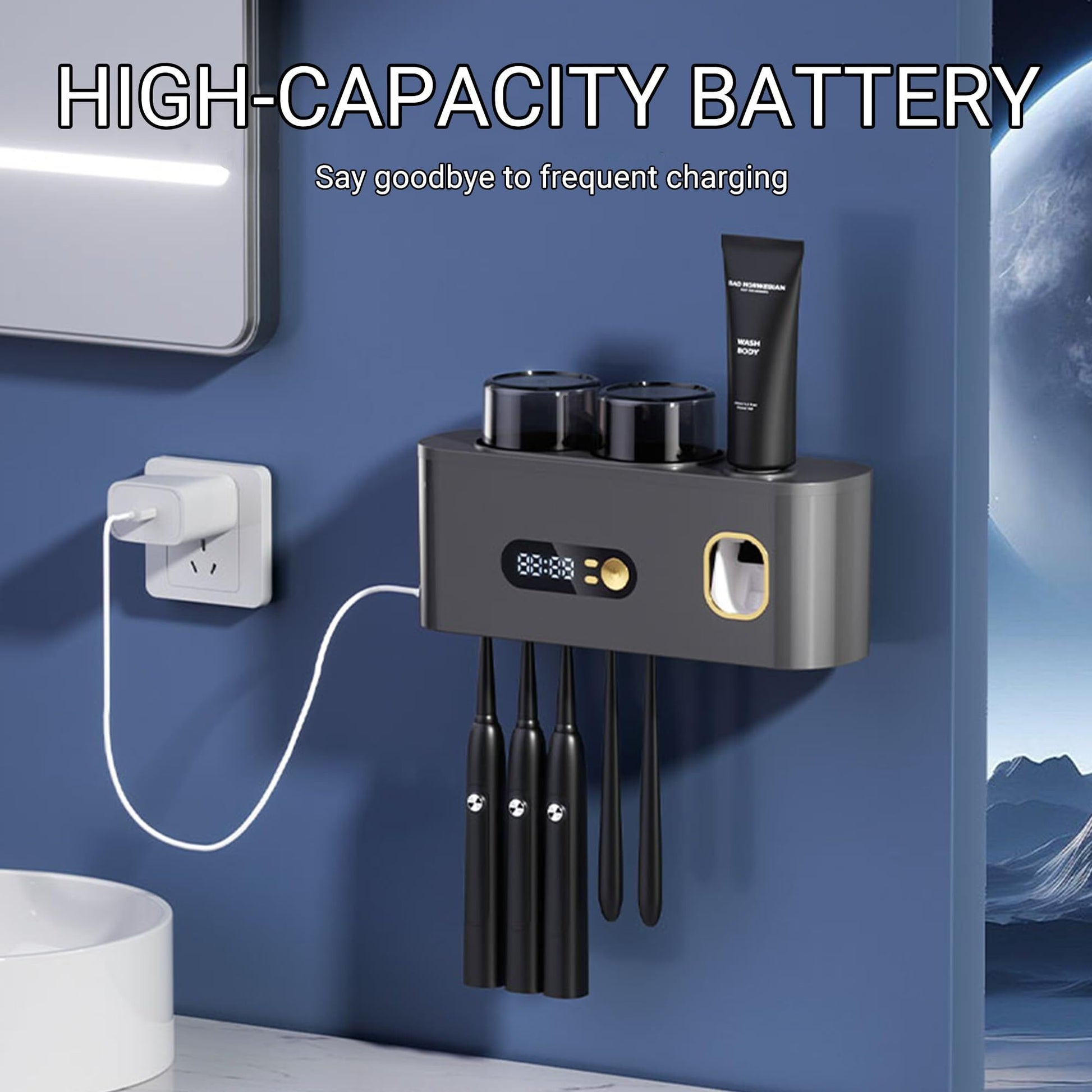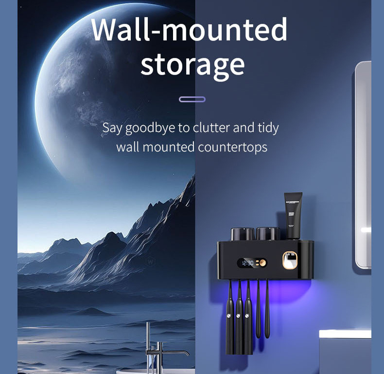 Upgrade your bathroom routine with thisUV toothbrush holder, a sleek, space-saving solution that combines hygiene, convenience, and modern design. Engineered for families and health-conscious individuals, it features built-in UV-C sterilization technology that kills 99.9% of bacteria on toothbrushes, ensuring clean and safe brushing every day. The device automatically activates disinfection cycles at set intervalsno buttons to press, just peace of mind. With five spacious slots, it comfortably holds electric or manual toothbrushes, while two inverted cup holders promote airflow and prevent water accumulation. A smart toothpaste dispenser delivers the perfect amount with a simple touch, reducing waste and mess. The high-definition LED screen displays time clearly and brightly, adding a tech-savvy touch to your daily ritual. Powered by a long-lasting rechargeable battery and charged via Type-C cable, it runs for weeks between charges. Install it effortlessly on any smooth surface using strong adhesive tapeno drilling, no tools, no damage. Say goodbye to clutter and hello to a smarter, cleaner, more organized bathroom experience.