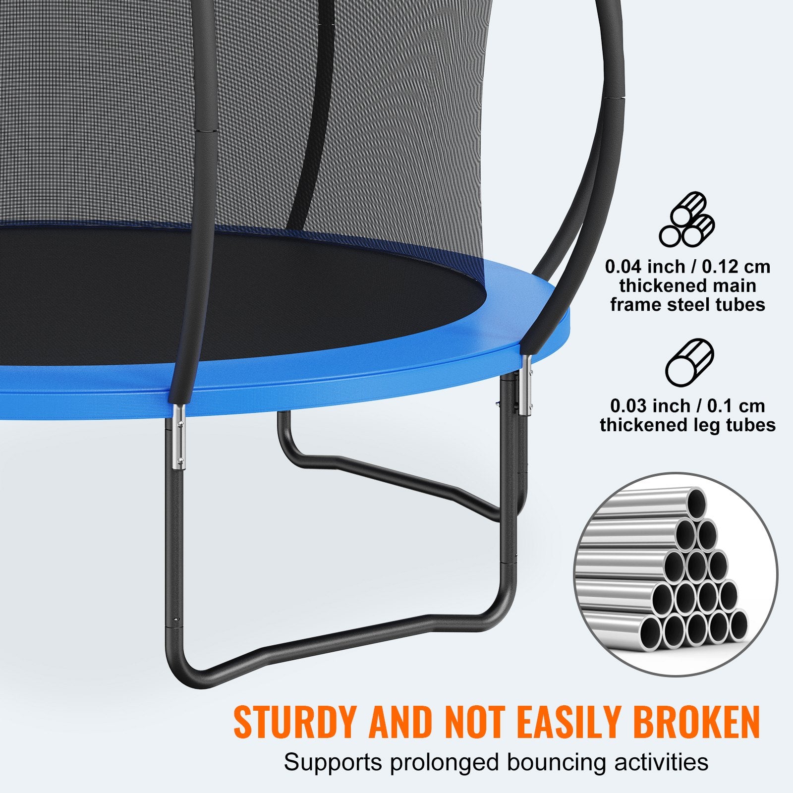 This recreational trampoline is made with upgraded high-quality materials. Its ring leg design with thickened steel tubes ensures even and firm support, making it resistant to bending even with prolonged use. The trampoline has undergone rigorous testing and can withstand a weight of around 400 lbs / 180 kg, making it suitable for children to bounce on.