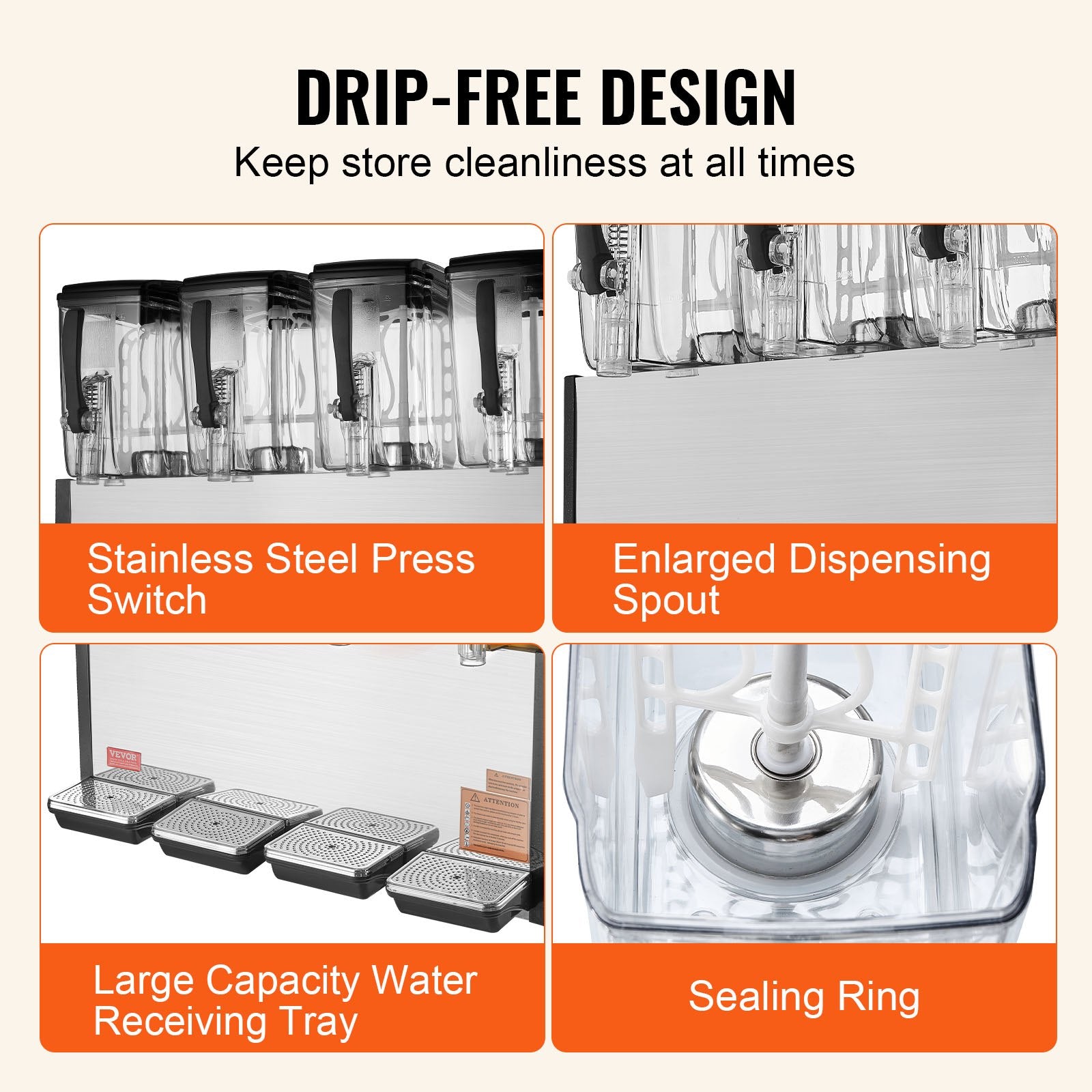 VEVOR Commercial Beverage Dispenser, 4 Tanks 12 L Per Tank Juice Dispenser, 510W Stainless Steel Ice Tea Drink Machine with 7℃-12℃ Cooling Temperature, for Cold Drink Restaurant Bar Party