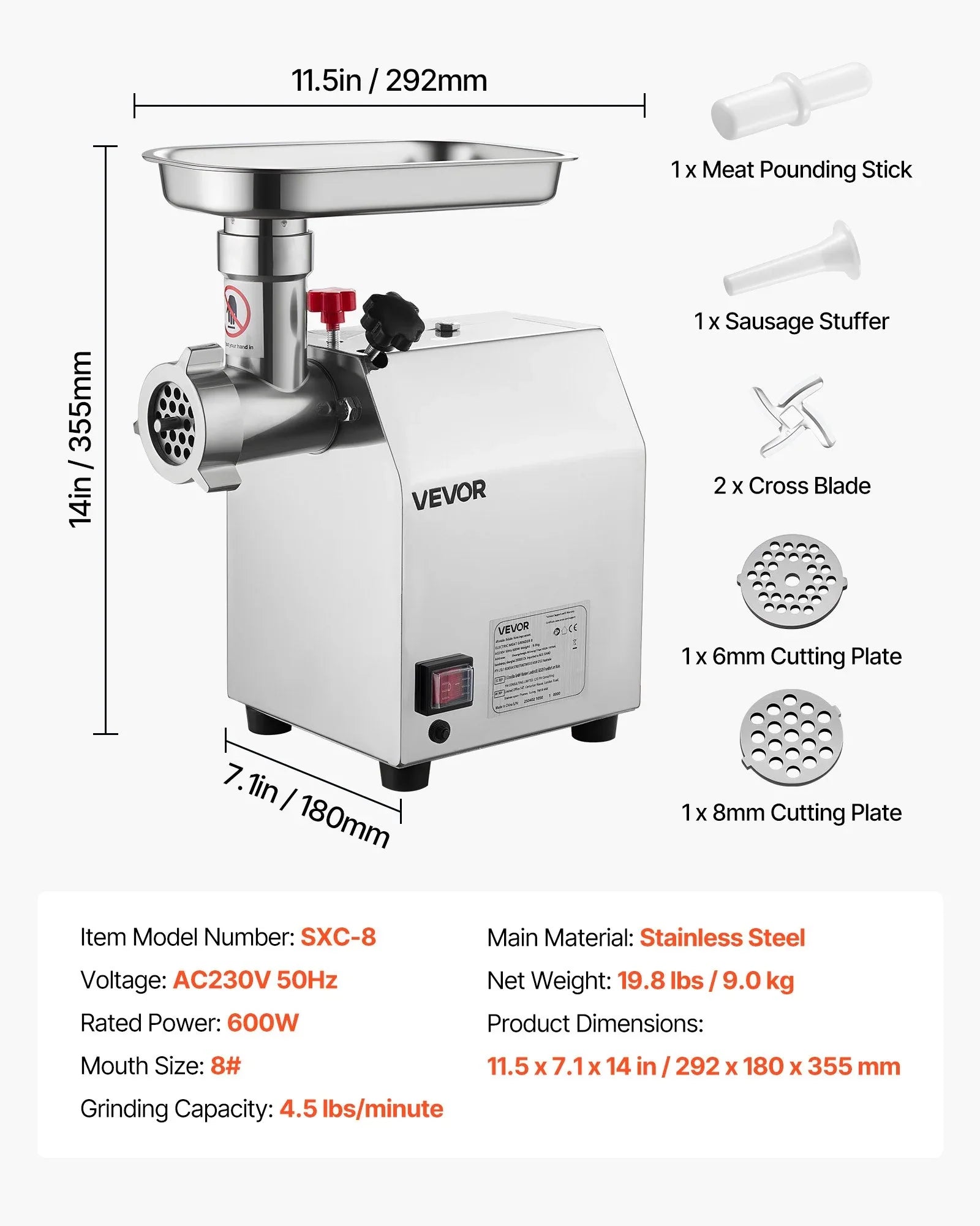 The commercial countertop meat grinder, mouth size 8#, features a highly efficient 600W pure copper motor capable of grinding 4.5 lbs of meat per minute. It can operate continuously for 30 minutes, making it ideal for large-scale commercial meat grinding needs. Avoid letting the grinder idle for too long as it may damage the motor. Remember to promptly turn off the power when not in use