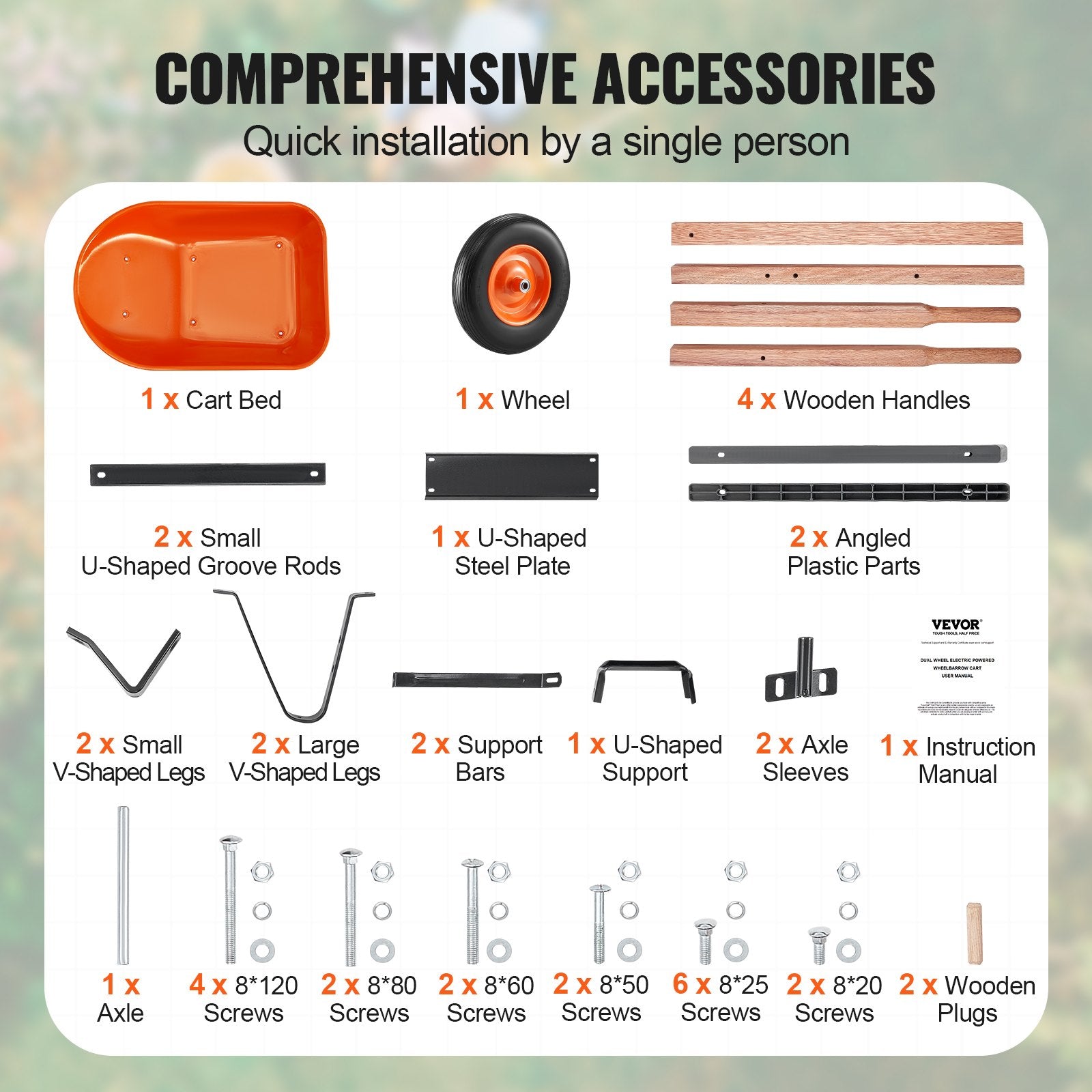 The package includes: 1 tray, 4 wooden handles, 2 angled plastic pieces, 1 U-channel steel plate, 2 support bars, 1 axle, 2 small V-legs, 2 large V-legs, 2 axle sleeves, 1 U-support (wooden handle connection), 2 small U-channel rods, 1 wheel, 2 wooden plugs, screws (8120) x 2, screws (870) x 4, screws (845) x 2, screws (822) x 6, screws (820) x 2, screws (880) x 2.