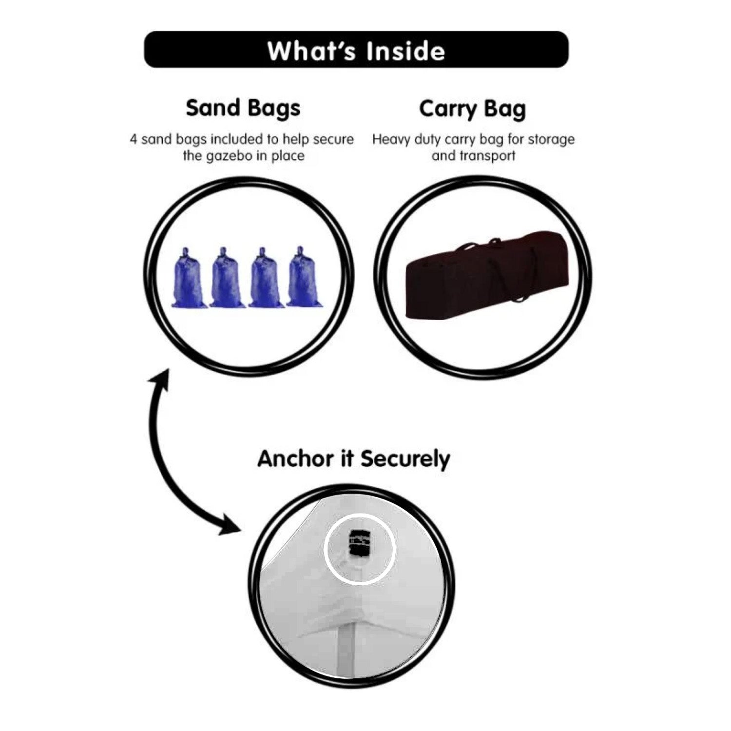 Everything you need: As well as the main unit and 5 walls this combo pack also comes with a handy carry bag and sandbags to help secure your marquee.
