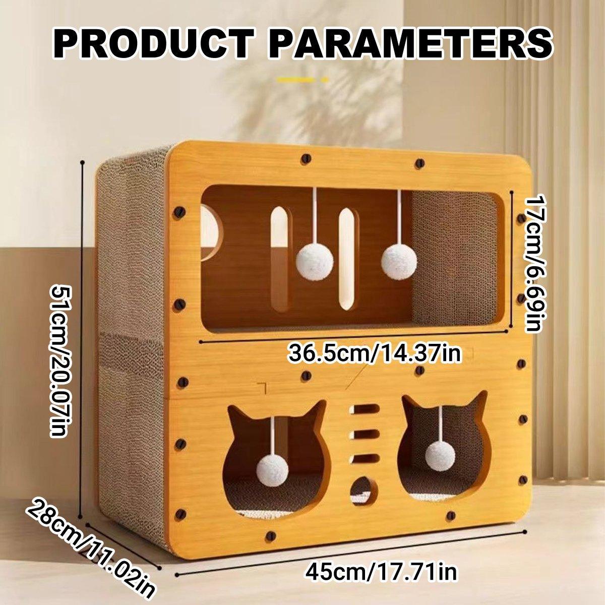 This wear-resistant cat scratcher board house is perfect for providing your feline friend with a dedicated space to scratch, climb, and relax throughout all seasons. Combining a comfortable resting area with a scratch-resistant tower, this cat house promotes healthy scratching and playtime while keeping your furniture safe. Constructed from durable, high-density corrugated cardboard and reinforced with sturdy wood, it is built to withstand daily wear and tear. The charming design complements any decor, making it a functional and stylish addition to your home.